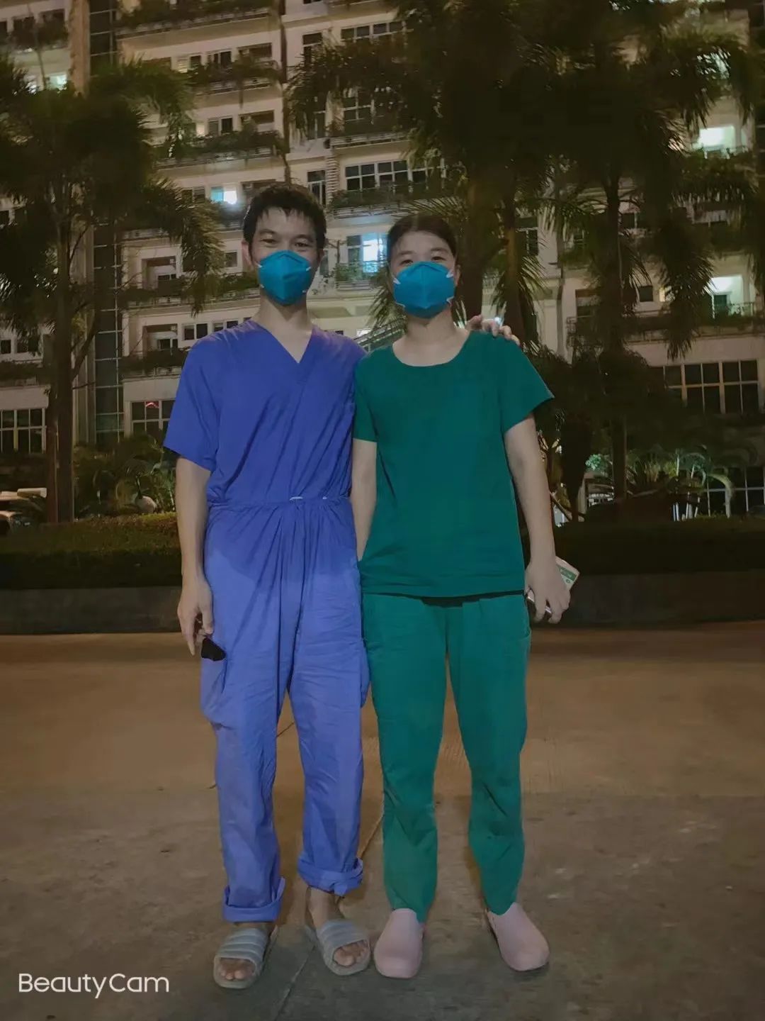 相隔半月,夫妻俩在医院疗养院楼前匆匆合影